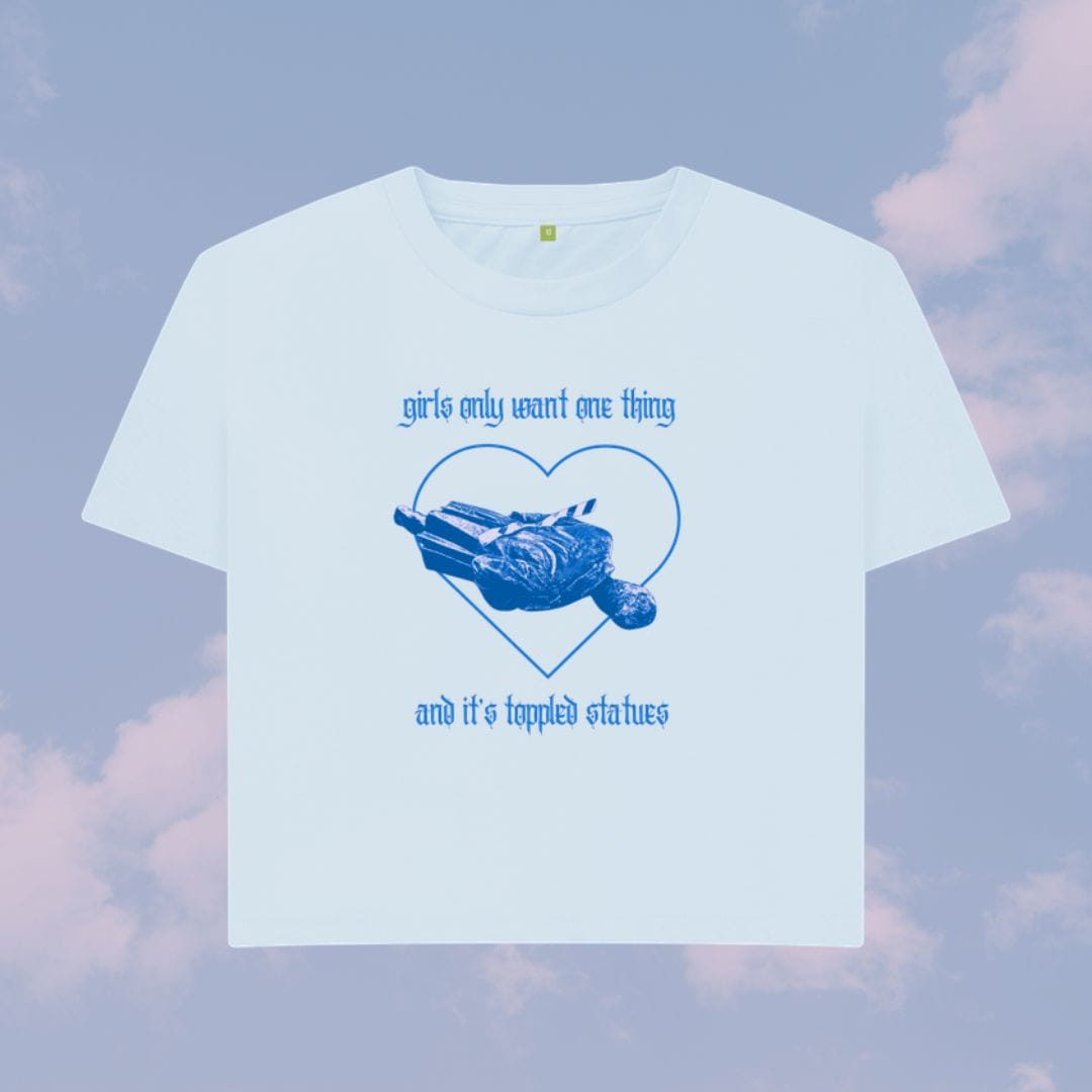 ...and its a baby blue boxy fit tee and a toppled statue.