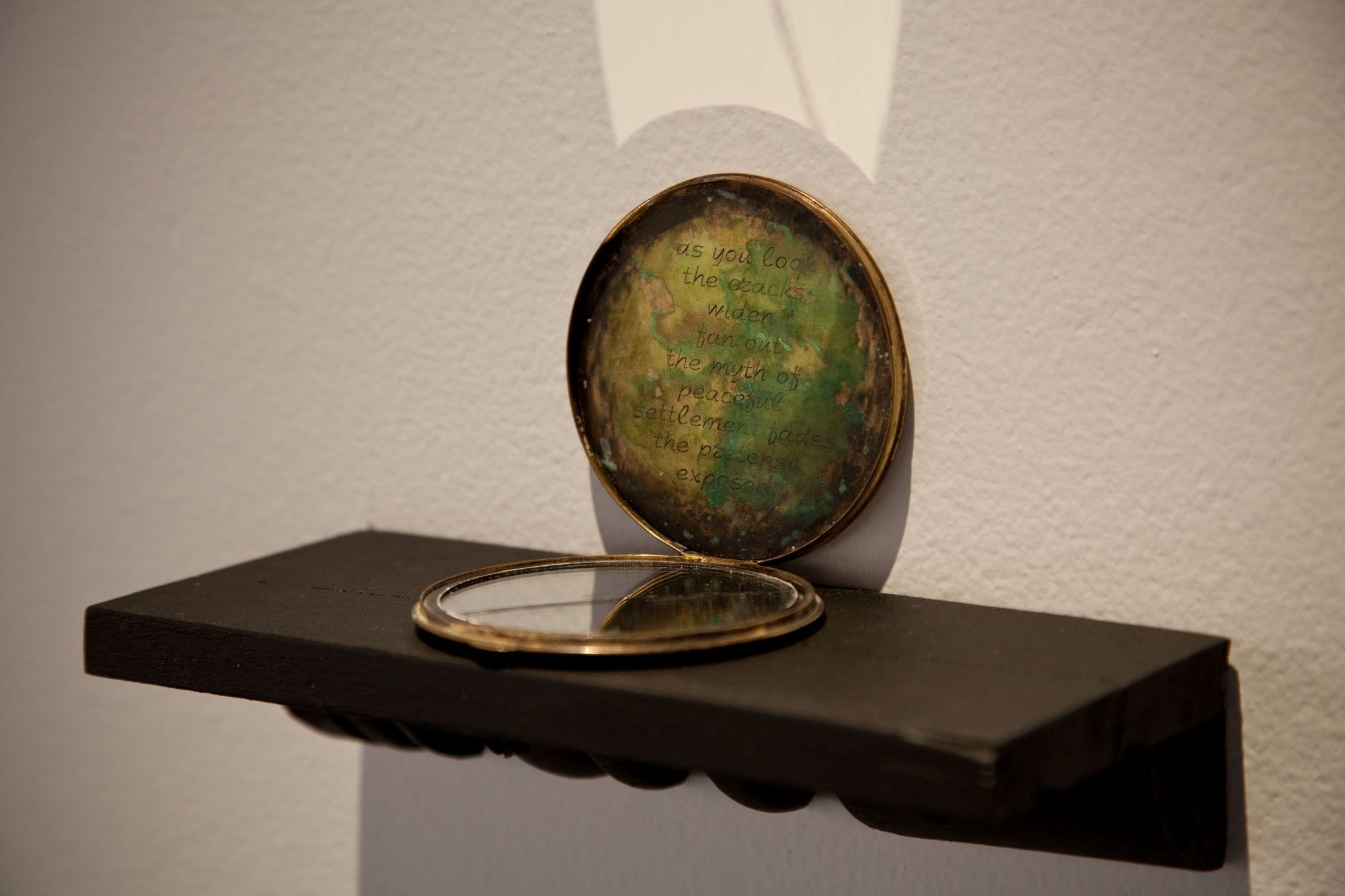 The Plimsoll Gallery is dark, with shafts of light, and it’s an entire installation-based artwork, with many elements. It’s extremely well put together, and while I was struck again and again by individual set pieces, what really makes this succeed is the cohesion. Each work informs every other work, and you put the fragments together. There is a story here, but it is not one story: it is many fragments and shards of stories, all pulled together. The objects are made by a superb jeweller with a strong commercial practice, so everything is well-made and it all looks ‘good’, but it never looks too good, and the staining and tempering that exists across the show are amongst the most beautiful decay I’ve ever seen.