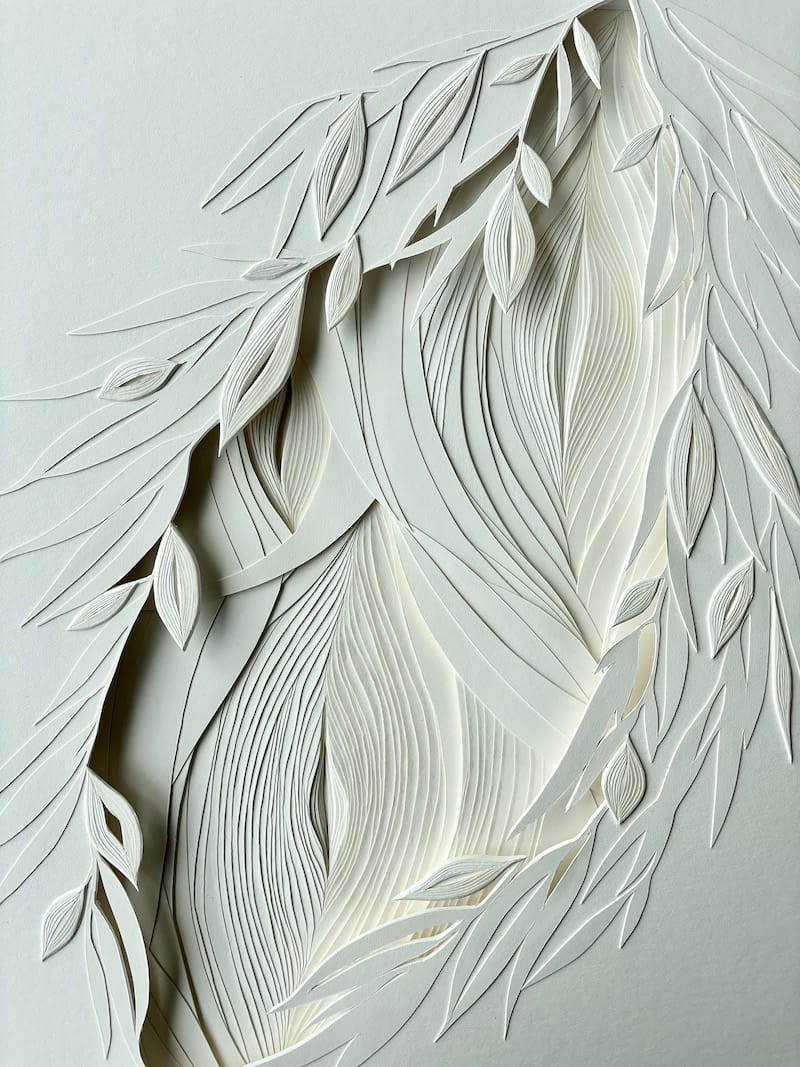Botanical art still exists, and it’s important for scientific record. Photography has not replaced it; it has a useful function. To me it’s possible for it to inform other art, or for the techniques of botanical work to be applied to other forms of art. Sarah White has a background in science, but moved into making art in 2015. Her images in Patience are combinations of painting and paper carving; when I first saw them, I thought she’d actually collected leaves and incorporated them into the work, but closer examination showed me that no, these were paintings. The delicacy of the palette used expertly depicts eucalyptus leaves in subtle stages of decay, that are used to create symbolic images that sit upon many layers of carved paper, that suggest a near-infinite recession – while still, the images are mobile and suggest a process of decay and time. There’s something about the works that imply a kind of sensual evocation – the works are a construction, a very precise one that is meant to imply something significant.